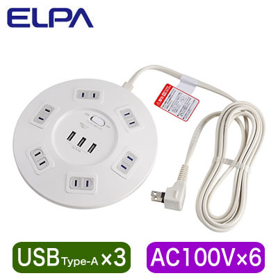 ELPA WLS-R6332BUA(W) 丸形USB電源タップ 6個口 USB Type-A:3ポート 耐雷サージ機能付き