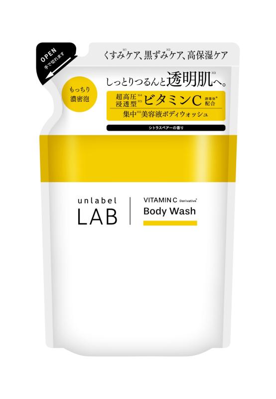 unlabel アンレーベル Vクリーミーモイスト ボディウォッシュ 詰め替え シトラスペア―の香り ボディソープ ビタミンC1 透明肌2 くすみ3 黒ずみ4 高保湿5 角質ケア 310mLビタミンC1配合の濃密泡で、全身つるすべ&透明感2あふれるしっとりうるツヤボディへ。くすみ3ケア、黒ずみ4ケア、高保湿5ケアシトラスペアーの香り1超高圧処理したテトラヘキシルデカン酸アスコルビル(保湿成分) 2古い角質や汚れを落とすことによる 3乾燥してキメが乱れた肌 4汚れや古い角質による 5当社内において【ご使用上の注意】●お肌に異常が生じていないかよく注意して使用してください。●お肌に合わないとき即ち次のような場合には、使用を中止してください。そのまま使用を続けますと、症状を悪化させることがありますので、皮フ科専門医等にご相談されることをおすすめします。(1)使用中、赤味、はれ、かゆみ、刺激等の異常があらわれた場合(2)使用したお肌に、直射日光があたって前記のような異常があらわれた場合●傷やはれもの、しっしん等、異常のある部位には使用しないでください。●目に入らないよう注意し、入ったときはすぐに洗い流してください。 ●極端に高温又は低温、直射日光のあたる場所、乳幼児の手の届く場所には保管しないでください。●植物成分などを配合しているため、濁り、沈殿、変色、変臭が生じる可能性がありますが、品質に問題はありません。●ノズル先端で中身が固まり、強く押したときに液体が飛び出す場合がありますので、ご注意ください。