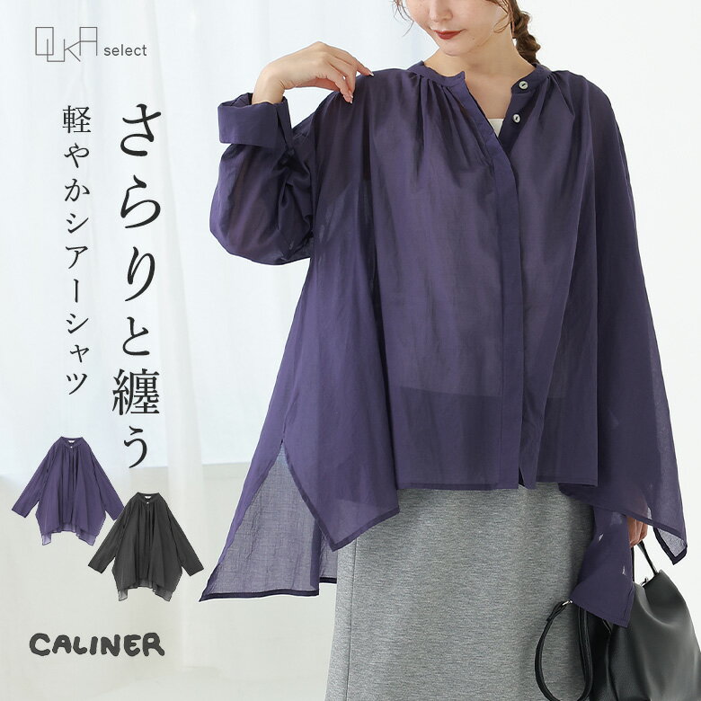 【感謝価格】【送料無料】 シアーシャツ レディース 春 夏 秋 ブラウス トップス ロングシャツ シャツ 長袖 変形ヘム 比翼仕立て 前後着丈差 羽織り コットン100% 透け感 通気性 CALINER カリネ OUKA オウカ※メール便可※【10】