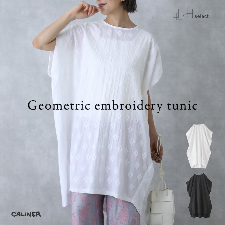 【感謝価格】 ワンピース レディース 春 夏 秋 半袖 ショートスリーブ チュニック丈 刺繍 異素材 コットン100% 透け感 カットソー生地 体型隠し 体型カバー 着回し CALINER カリネ OUKA オウカ※返品交換不可※※メール便可※【10】