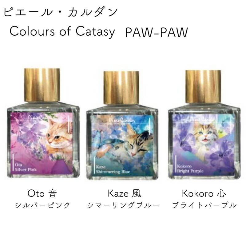 愛くるしい猫たちにインスパイアされて誕生したColour of Catasyに既存6色とはまた違った、日本をリスペクトした3色が仲間入り!今回も全てラメ入り、ガラスペン等つけペンでお楽しみください。Oto 音 シルバーピンク音楽を奏でるようなピンク、ただ可愛いベビーピンクではなく、少し赤紫がかった部分もあります。シルバーラメにより乾くとメタルピンクの様相が現れ、淡いピンクとは全く違った色を表します。一色で色んな顔を持つインクです。Kaze 風 シマーリングブルー シアンの空に風が吹く印象の水色系ブルー。つけペンで書くとラピスラズリのようなブルーが見え、筆を使うとシアンのような水色が見えます。ゴールドラメとのペアリングがとてもキレイなインク、ぜひ現物を見て体験して頂きたい!Kokoro 心 ブライトパープル青系の藤の花びらを思わせる、パープルでもどちらかと言うと青味が強い藤色。一見クールな色に見えますが、ラメと相まって柔らかさを醸し出します。ブルー系の藤色にブルーラメがのり、そこにピンクが見える、ブルーラメとパープルのこのペアリングもまた見逃せない逸品です。【商品仕様】40×60×40mm25ml【免責事項】在庫データは定期的に更新しておりますが、一部の商品につきましては実店舗と在庫を共有しておりますので、ご注文のタイミングによっては欠品・完売となりご用意が出来ない場合がございます。ご了承の程よろしくお願い申し上げます。