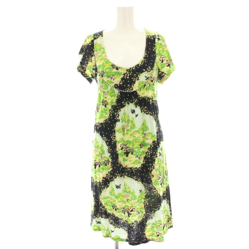 【中古】シェリーラファム Cherir la femme ワンピース ひざ丈 半袖 総柄 プリント 麻 リネン混 Uネック M 黒 グリーン 黄緑 イエローグリーン 91049 /HN レディース 【ベクトル 古着】 250917
