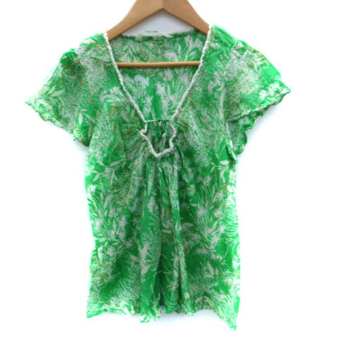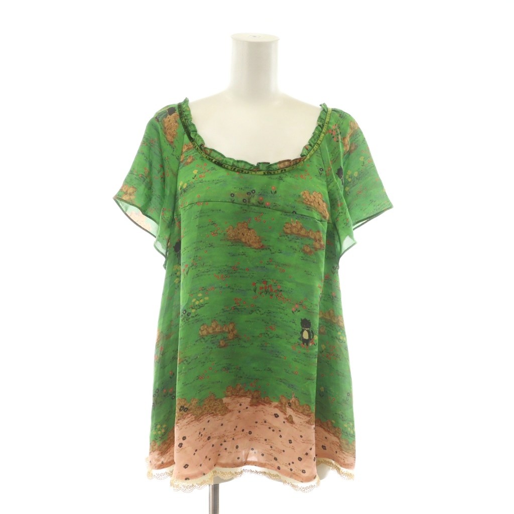 【中古】フランシュリッペ franche lippee cherir la femme ネコ騎士プリントフレアスリーブスモックブラウス シャツ 半袖 M 緑 グリーン ピンク 総柄 427538 /RR レディース 【ベクトル 古着】 251106