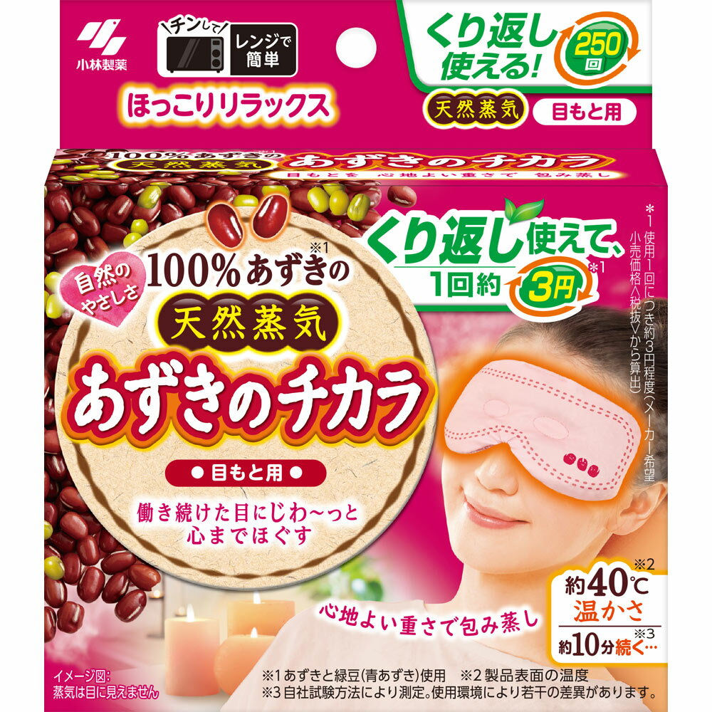 ※写真はイメージです。実際にお届けする商品とパッケージなどが異なる場合がございます。商品の特徴●あずきで作られた蒸気※1温熱ピロー●レンジで温めて使用します。●あずきの天然蒸気※1の温熱で温め、心までほぐしていきます。●繰り返し250回使えるので経済的です。●適度な重みがあり、目にフィットするので、効果的に温めることができます。●温め過ぎを知らせる危険防止サイン付です。※1:蒸気は目に見えません。原料・成分等【素材】ポリエステル、綿【内容物】あずき、緑豆(青あずき)用法及び用量【使用方法】1.透明袋から製品を取り出し、文字の書いてある面を下にして電子レンジ中央に置く。折りたたまない。豆の偏りがないようにならしてから置く。2.加熱時間に従い加熱する。600Wを超える出力では加熱しない。※加熱中は電子レンジのそばを離れない。加熱時間500W40秒600W30秒3.文字の書いてある面を上にして目にのせる。10分を目安に使用する。*電子レンジ機能以外での加熱不可。*自動温め不可。*所定時間を超えて加熱しない。*業務用電子レンジ使用不可。使用法等この説明書きをよく読み、保管しておいてください。電子レンジで加熱した後、商品の表面に「キケン」の文字が出ている場合は使用できない。「キケン」の文字が消えるまで冷ましてから使う。熱すぎるまま使うと、目に悪影響が出るおそれがある。電子レンジの機種によっては加熱時間通りに加熱しても「キケン」の文字が出る場合がある。<使用上の注意>●目以外には使用しない。●使用時は目を閉じて使う。●皮ふに異常(外傷、湿疹、かぶれ、やけど、日焼けによる熱傷など)のある部位や発熱している部位、および粘膜には使用しない。●異常がある場合はすぐに使用を中止し、皮ふ科医等に相談する。●自らの意思で本品を取り去ることのできない人、子供および泥酔時や就寝中は使用しない。●糖尿病など、温感および血行に障害をお持ちの方、肌の弱い方はやけどのおそれがあるため、医師又は薬剤師に相談する。●長時間、同じ部位に当てない。●こげたり、破れた場合は使用しない。<加熱時の注意>●指定の加熱時間とワット数を必ず守る。●使用前に電子レンジの汚れをよく拭き取る。取れない場合は、レンジ使用可能で清潔な皿にのせて加熱する。●レンジ庫内が温かい状態で加熱すると、想定よりも熱くなる可能性があるため、庫内を冷ましてから加熱する。●自動モード(オート加熱、おまかせ加熱)での加熱禁止。また、あずきを使用しているため、所定の時間を超えて加熱すると、あずきがこげて使えなくなることがある。●加熱時間には充分注意する。●同封の脱酸素剤は加熱しない。●次の加熱までに4時間以上の時間を空けること。使用後、4時間以上空けずに加熱すると、あずきが異常に熱くなり、発火、火災などの思わぬ事故を招くおそれがある。●ターンテーブル型の電子レンジを使う場合には、テーブルが回っていることを確認する。●加熱した本品を電子レンジから取り出す際には、本品温度に注意する。熱いと感じたときは、無理に取り出さず、充分冷ましてから取り出す。<繰り返し使用の注意>●あずきは繰り返し使用により水分を充分に保持できなくなる。水分を保持できなくなると、温まりにくくなったり、こげやすくなるおそれがある。●繰り返し使用可能回数は250回。250回を超えたら捨てる。*使用条件、環境によっては250回以内に使えなくなる場合もある。また250回以内でも何か異常を感じた場合は、使用を中止する。<その他の注意>●涼しい風通しのよい場所に保管する。●本品は洗濯できない。●本品は食べられない。●捨てるときは、市区町村で定める区分に従う。取扱上の注意点●涼しい風通しのよい場所に保管する。保存方法・消費期限パッケージに記載製造国日本お問合せ先(製造販売元)小林製薬株式会社大阪府大阪市中央区道修町4−4−100120−5884−35 広告文責・販売業者株式会社マツモトキヨシ/お問い合わせ先:0120-845-533