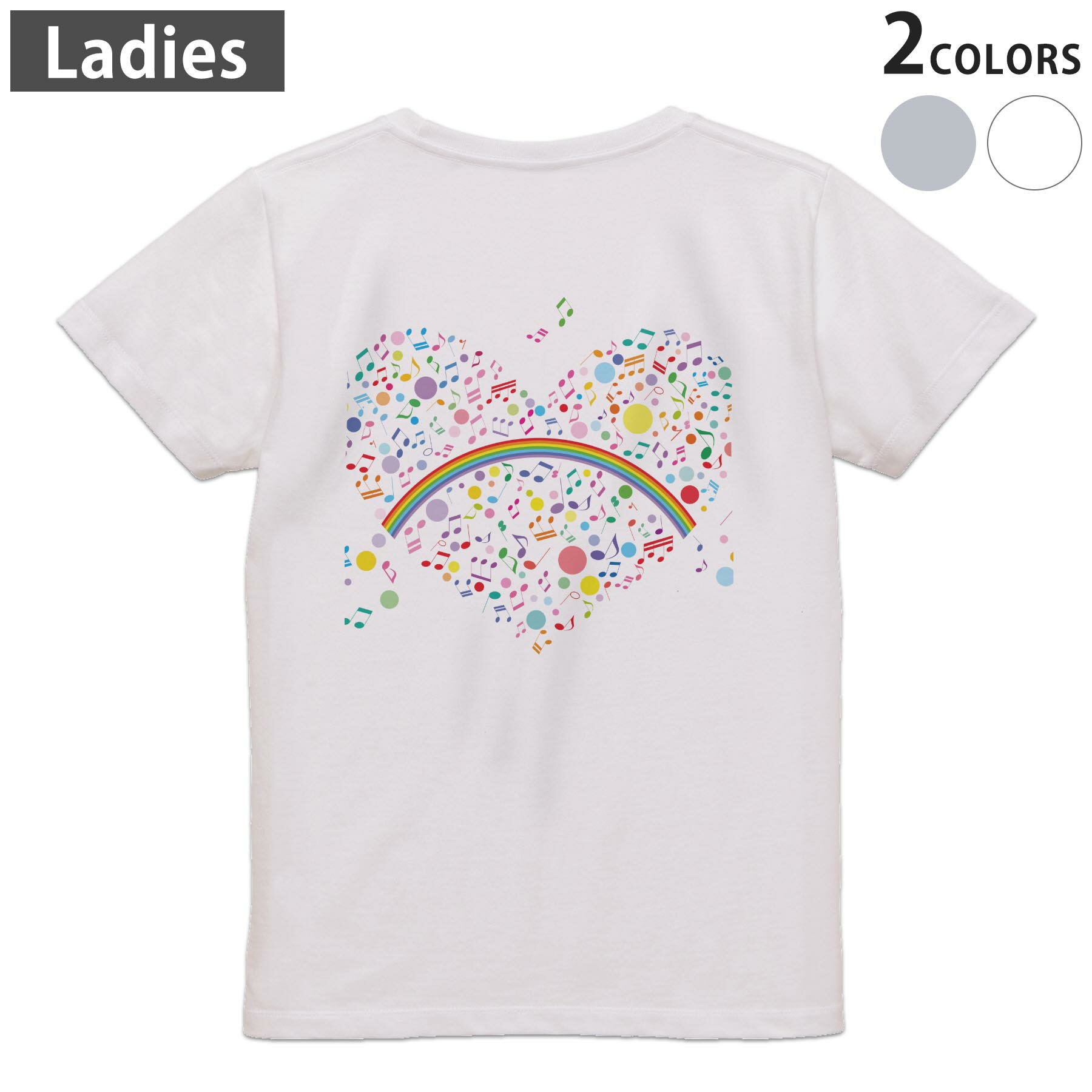 Tシャツ レディース バックプリント 半袖 ホワイト グレー デザイン M Lティーシャツ T shirt 004795 ハート 音符 虹 カラフル