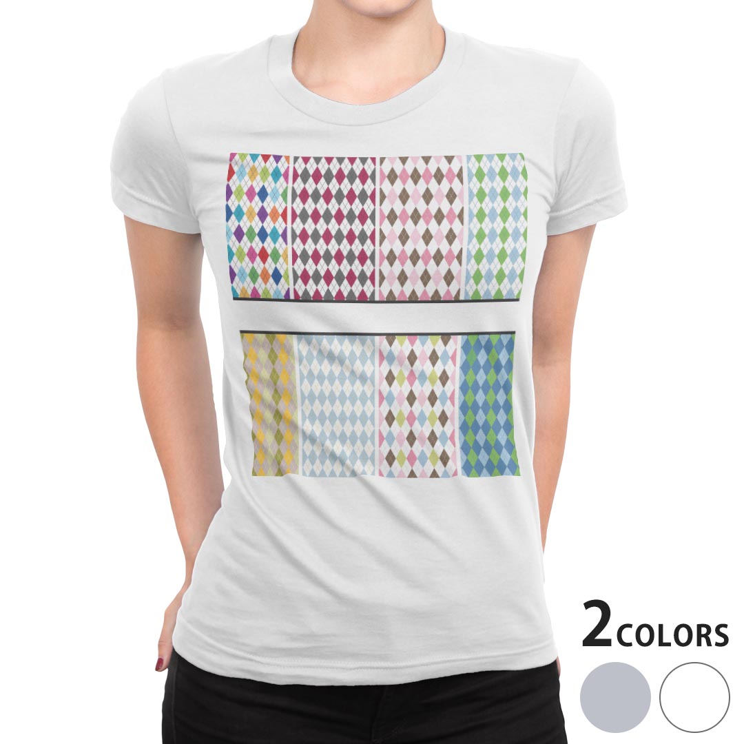 tシャツ レディース 半袖 白地 デザイン M L 白 ホワイト グレー Tシャツ ティーシャツ T shirt 005369 チェック・ボーダー カラフル ダイヤ 模様