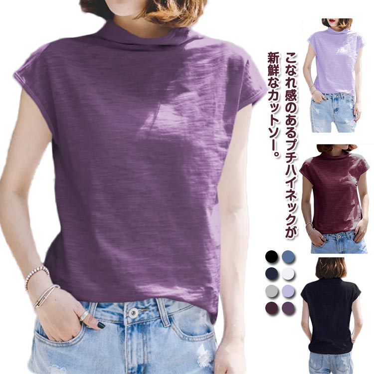 カラフル全8色展開 Tシャツ レディース 半袖 フレンチスリーブ カットソー トップス コットン 綿 フレンチスリーブ 半袖 二の腕カバー プチハイネック モックネック プルオーバー 無地 シンプル カジュアル ひんやり 涼感 送料無料 20代 30代 40代