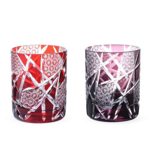 J-kitchens 郷愁 切子 ペア グラス カップ ロック グラス Φ70xH90mm 210cc 乱彫小紋 レッド & パープル 美匠 Current Model