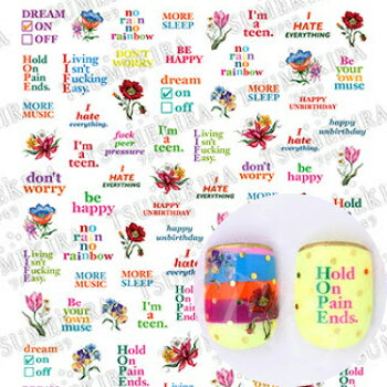 【品番・カラー】 MESSAGE vivid color アイキャッチなvivid colorでまとめた、メッセージとフラワーブーケのデザインです。 ロゴTシャツを着る感覚で、ネイルにメッセージのデザインは如何でしょうか。 花も簡単に貼り合わせ易いように、ミニブーケのようにデザインしました。DAISY'S GARDENシリーズ同様に、手描きしたものをステッカーにして頂きました。 【内容量・備考】 NN-DAI-120 120mm×88mm 【※メーカーにてパッケージがリニューアルされる場合がございます。その際の返品・交換はお受けしかねますので、ご了承の上ご購入ください※】●お取り寄せ商品につきまして● ご注文後のキャンセルはお受けする事ができませんため、必ず納期時期の確認と商品をお間違えのないようご確認下さい。 また急遽メーカー欠品や製造中止となりご用意ができなくなる場合がございます。 その際は代替品のご提案やご注文をキャンセルさせて頂く場合がございます。