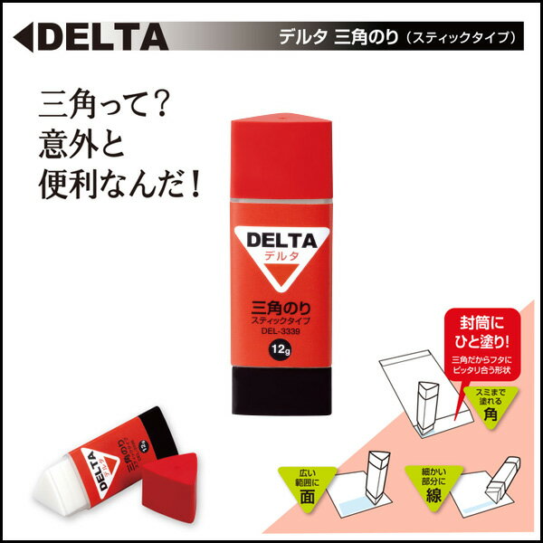 商品名デルタ三角のり 商品番号DEL-3339-00 規格 カラー 仕様●仕様/固形スティックのり●内容量/12g●主成分/PVP●本体サイズ/幅30×奥行き27×高さ88mm●吊り下げパッケージ入り(ブリスターパックサイズ/幅65×奥行き約30×高さ180mm) JANコード4974214174832新発見!三角って、意外と便利なんだ! 角と面で使い分けが出来る三角形のスティックのりです。広い範囲は面で塗り、細かい部分は角で塗る!三角なので転がらない!三角なので封筒とじ(封緘)に便利!封筒のフタと三角形がピッタリ合う形状なので、封筒にひと塗りで糊付ができます。一般紙・うすい紙等の接着や封緘に。(封筒のフタに塗りやすい形状)事務用・工作などでご活用ください。