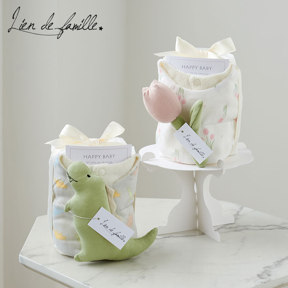 育児で必ず使うオムツとかわいいラトルを、おくるみで包んだ今までにない全く新しいおむつケーキ。 見栄えもよく、出産祝いに贈りやすいギフトアイテムです。 Lien de familleならではのくすみカラーとデザイン性、素材や機能性にこだわった「もらって嬉しい」アイテムを取り合わせました。 写真映えもバッチリな恐竜ラトルは、生地も縫製も完全日本製。職人が1つ1つ丁寧に作っています。 くすみカラーがおしゃれなおくるみは、お昼寝・お出かけにマルチにお使いいただけます。 【セット内容】・おむつ10枚(テープSサイズ/ナチュラルムーニー) ・おくるみ1枚 ・オーガニックラトル1個 ●サイズおくるみ(平置き)(約)縦100cm×横100cm ラトル(約)長さ10cm ●素材おくるみ コットン100% ラトル コットン100% ●生産国日本 ※こちらの商品は【のし・ラッピング対象外】です。 ※商品の色は写真とは若干異なって見える場合がありますのでご了承ください。 ※不良品以外の返品は不可とさせていただきます。 本商品は大変デリケートな生地・仕様となっておりますので、手洗いにてやさしくお洗濯をして下さい。 ※手洗いを推奨しております。 洗濯機をご使用の場合はネットに入れて下さい。1円特典 おめでとう!の気持ちをさらに演出するメッセージカード 40種類以上の豊富なデザインからお選びいただけるメッセージカード。おむつの形をしたカードケース付きです。 カードのデザインを見る 写真映え抜群!おしゃれなベビーポスター ベビーのお名前と誕生日が入ったベビーポスターは豊富なデザインからお好きな一枚をお選びいただけます。 ポスターのデザインを見る