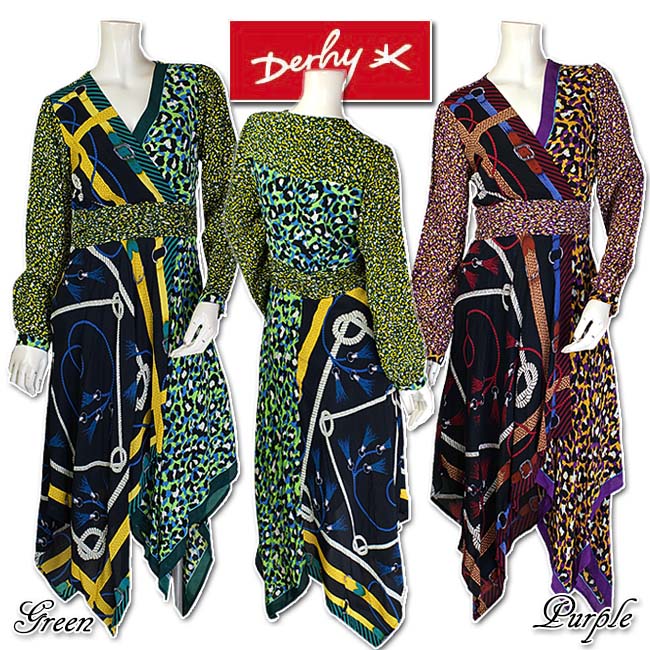 フランス "Derhy" ジグザグ裾がお洒落なチェーン ヒョウ柄ワンピース グリーンとパープル サイズSとMとL【当初26273】【ルネデリ】【新着商品】【最新着】