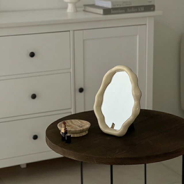 厚みを持たせた曲線フレームのデスクトップミラーです。 ニュアンス感のあるデザインがインテリアのアクセントになります。 背面に金具が付いている為、リビングや玄関などで壁掛けミラーとしても使用可能です。 ■素材 フレーム:樹脂 ミラー:ガラス ■サイズ 縦約27.5cm×横約21.5cm×厚さ約3cm ※他のアイテム含め、荷物のサイズが変わる数量をお買い上げの場合に限り、送料変更がありますので別途ご連絡致します。