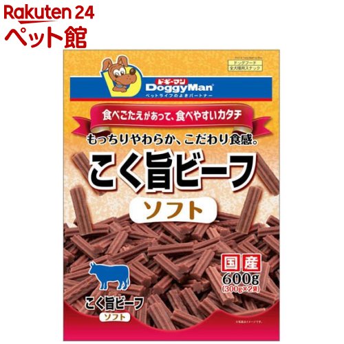 お店TOP>犬用品>犬のおやつ・サプリメント>犬のジャーキー・ガム・骨>ソフトジャーキー>こく旨ビーフ ソフト (600g)【こく旨ビーフ ソフトの商品詳細】●お肉が大好きな愛犬にボリューム満点もっちりやわらかビーフジャーキー。●お肉の旨味と香りを存分に堪能できる。●ソフトでちぎりやすく、食べやすい大きさにできる。●やわらかく、ちぎれるので噛む力が弱い幼犬やシニア犬、口が小さな超小型犬も美味しく食べられる。●ごほうびに、お散歩帰りなどにぴったり。【用法 用量】1日の目安給与量/幼犬・超小型成犬(5kg以下):〜3個、小型成犬(5〜11kg):3〜6個、中型成犬(11〜23kg):6〜12個、大型成犬(23〜40kg):12〜18個【召し上がり方】目安給与量を参考に1日1〜数回に分け、おやつとして与えてください。【こく旨ビーフ ソフトの原材料】肉類(牛肉、鶏肉)、小麦粉、脱脂大豆、糖類、ソルビトール、グリセリン、ミネラル類(ナトリウム)、保存料(ソルビン酸、デヒドロ酢酸ナトリウム)、調味料、ポリリン酸ナトリウム、発色剤(亜硝酸ナトリウム)、着色料(黄4、青1、赤106)【栄養成分】成分/粗たん白質:12%以上、粗脂肪:10%以上、粗繊維:1.5%以下、粗灰分:4.5%以下、水分:30%以下エネルギー/350kcal/100g【保存方法】★開封後要冷蔵 お買い上げ後は直射日光・高温多湿の場所を避けて保存してください。開封後は密封の上冷蔵し、賞味期限に関わらず早めに与えてください。【ブランド】ドギーマン(Doggy Man)【発売元、製造元、輸入元又は販売元】ドギーマンハヤシリニューアルに伴い、パッケージ・内容等予告なく変更する場合がございます。予めご了承ください。ドギーマンハヤシ537-0002 大阪府大阪市東成区深江南1-16-140120-086-192広告文責:楽天グループ株式会社電話:050-5306-1825[犬用品/ブランド:ドギーマン(Doggy Man)/]