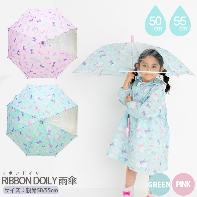 RIBBON DOILY 雨傘 50cm・55cm 手開き傘 子供用 通園 通学 入学準備 女の子 女子 女児 幼稚園 小学生 ピンク ミントグリーン りぼん リボン 透明窓 グラスファイバー 軽くて丈夫 かわいい