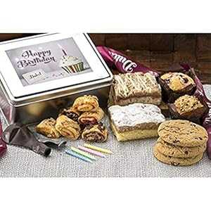 Gourmet Bakery Assortment Gift Box With Scented Candle By Dulcet Gift Baskets- Handmade Freshly Baked Sweet Treats- Tin Box Includes: Marble Loaf, Brownies, Hamen Tashen, Cookies, Blueberry Muffins