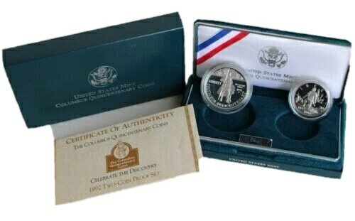 1992 Columbus Silver Dollar and 50 Cents 2 Coin PROOF Set Complete as Issued商品について流通/非流通 非流通額面 1ドル、50セント組成 銀/銅発行年 1992年刻印タイプ プルーフ造幣局所在地 フィラデルフィア/サンフランシスコグレード プルーフKM番号 該当なし製造国/地域 アメリカ合衆国修正アイテム番号認証 米国造幣局注意事項※以下の注意事項をご理解のうえ、ご購入ください■ 鑑定済みコイン・紙幣について各種コイン・紙幣の鑑定機関(NGC、PCGS、PMGなど)は、収集品の真贋鑑定およびグレーディングを行う専門機関です。鑑定後の商品は、専用ケース(スラブ)に封入され、状態を示すグレードが付与されます。■ グレードについてグレードはコイン・紙幣自体の状態を評価するものであり、ケース自体の品質や状態を保証するものではありません。製造・輸送時の影響により、以下のような状態が発生する場合がございます。- 軽微なスレ傷・拭き傷(特に光の角度で見えるもの)- ケース内部のホコリ・小さな異物(鑑定機関の検品基準を満たしている場合)- ラベルのズレ・わずかな傾きこれらは鑑定機関の基準内であり、返品・交換の対象とはなりませんのでご了承ください。■ ラベルの種類について各鑑定機関では、コイン・紙幣の状態や鑑定の結果に応じて異なるラベルが付与されます。- 通常ラベル(Standard/Regular):一般的なグレード付き鑑定済みコイン・紙幣- オーセンティック(Authentic):グレードなしで真贋のみ保証- 詳細グレード(Details):クリーニング跡やエッジのダメージがあるが本物と認定- 特別ラベル(Special Label):記念版や特定のデザインの限定ラベル - 例:NGC「Early Releases」「First Releases」、PCGS「First Strike」 などグレードやラベルの種類は、商品画像および説明文をご確認のうえ、ご購入ください。■ 在庫状況について当店の商品は海外から取り寄せております。ご購入のタイミングによっては在庫切れとなる場合がございます。その際はご連絡のうえ、ご注文をキャンセルさせていただく場合がございますので、あらかじめご了承ください。■ ご注文後のキャンセルについてご注文と同時に商品のお取り寄せを開始するため、お客様都合によるキャンセルは承っておりません。■ 配送についてお届けまでに通常2〜3週間ほどかかります。海外の祝日や天候、税関手続きにより通常より配送が遅れる可能性がございます。■ 保証について商品説明に英語で「保証(warranty)」と記載があっても、日本国内では適用されませんのでご了承ください。 当店では、商品到着後7日以内の初期不良に限り、対応させていただきます。 (返品規約の詳細については、楽天市場内の会社概要欄下部をご参照ください。)■ 商品の色・素材感について撮影環境やモニター設定により、実際の商品と色味や質感が異なる場合がございます。■ 価格変動について希少性の高い商品は市場価格の変動により、追加料金をお願いする場合がございます。追加料金に同意いただけない場合には、ご注文のキャンセルが可能ですので、ご安心ください。■ その他サービスについて海外製品の輸入代行も承っております。ショップに掲載されていない商品でもお探し可能ですので、お気軽にご相談ください。尚、業者販売(業販)や複数購入の場合、割引対応も可能です。ご希望の方はお問い合わせください。