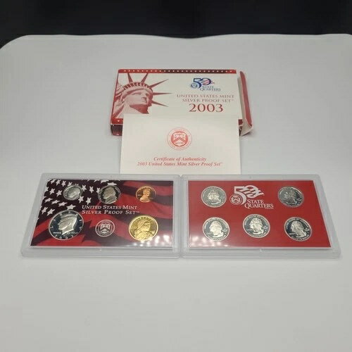 2003 U.S. Mint Silver Proof Set Complete As Issued w/ Box & COA-10-Coin Set (2)商品について出品者からのコメント「写真はお届けする現品です。」認証:米国造幣局流通/非流通:非流通刻印の種類:プルーフ発行年:2003年額面:10ドル素材:銀製造国/地域:アメリカ合衆国注意事項※以下の注意事項をご理解のうえ、ご購入ください■ 鑑定済みコイン・紙幣について各種コイン・紙幣の鑑定機関(NGC、PCGS、PMGなど)は、収集品の真贋鑑定およびグレーディングを行う専門機関です。鑑定後の商品は、専用ケース(スラブ)に封入され、状態を示すグレードが付与されます。■ グレードについてグレードはコイン・紙幣自体の状態を評価するものであり、ケース自体の品質や状態を保証するものではありません。製造・輸送時の影響により、以下のような状態が発生する場合がございます。- 軽微なスレ傷・拭き傷(特に光の角度で見えるもの)- ケース内部のホコリ・小さな異物(鑑定機関の検品基準を満たしている場合)- ラベルのズレ・わずかな傾きこれらは鑑定機関の基準内であり、返品・交換の対象とはなりませんのでご了承ください。■ ラベルの種類について各鑑定機関では、コイン・紙幣の状態や鑑定の結果に応じて異なるラベルが付与されます。- 通常ラベル(Standard/Regular):一般的なグレード付き鑑定済みコイン・紙幣- オーセンティック(Authentic):グレードなしで真贋のみ保証- 詳細グレード(Details):クリーニング跡やエッジのダメージがあるが本物と認定- 特別ラベル(Special Label):記念版や特定のデザインの限定ラベル - 例:NGC「Early Releases」「First Releases」、PCGS「First Strike」 などグレードやラベルの種類は、商品画像および説明文をご確認のうえ、ご購入ください。■ 在庫状況について当店の商品は海外から取り寄せております。ご購入のタイミングによっては在庫切れとなる場合がございます。その際はご連絡のうえ、ご注文をキャンセルさせていただく場合がございますので、あらかじめご了承ください。■ ご注文後のキャンセルについてご注文と同時に商品のお取り寄せを開始するため、お客様都合によるキャンセルは承っておりません。■ 配送についてお届けまでに通常2〜3週間ほどかかります。海外の祝日や天候、税関手続きにより通常より配送が遅れる可能性がございます。■ 保証について商品説明に英語で「保証(warranty)」と記載があっても、日本国内では適用されませんのでご了承ください。 当店では、商品到着後7日以内の初期不良に限り、対応させていただきます。 (返品規約の詳細については、楽天市場内の会社概要欄下部をご参照ください。)■ 商品の色・素材感について撮影環境やモニター設定により、実際の商品と色味や質感が異なる場合がございます。■ 価格変動について希少性の高い商品は市場価格の変動により、追加料金をお願いする場合がございます。追加料金に同意いただけない場合には、ご注文のキャンセルが可能ですので、ご安心ください。■ その他サービスについて海外製品の輸入代行も承っております。ショップに掲載されていない商品でもお探し可能ですので、お気軽にご相談ください。尚、業者販売(業販)や複数購入の場合、割引対応も可能です。ご希望の方はお問い合わせください。