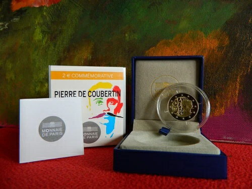 フランス、2013年、ピエール・ド・クーベルタン、2ユーロ硬貨、発行時のプルーフ/BE