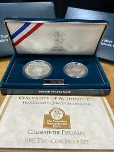 1992 P-S コロンバス シルバー ダラーと 50 セント 2 コインのプルーフ セットが発行された状態で完成しました