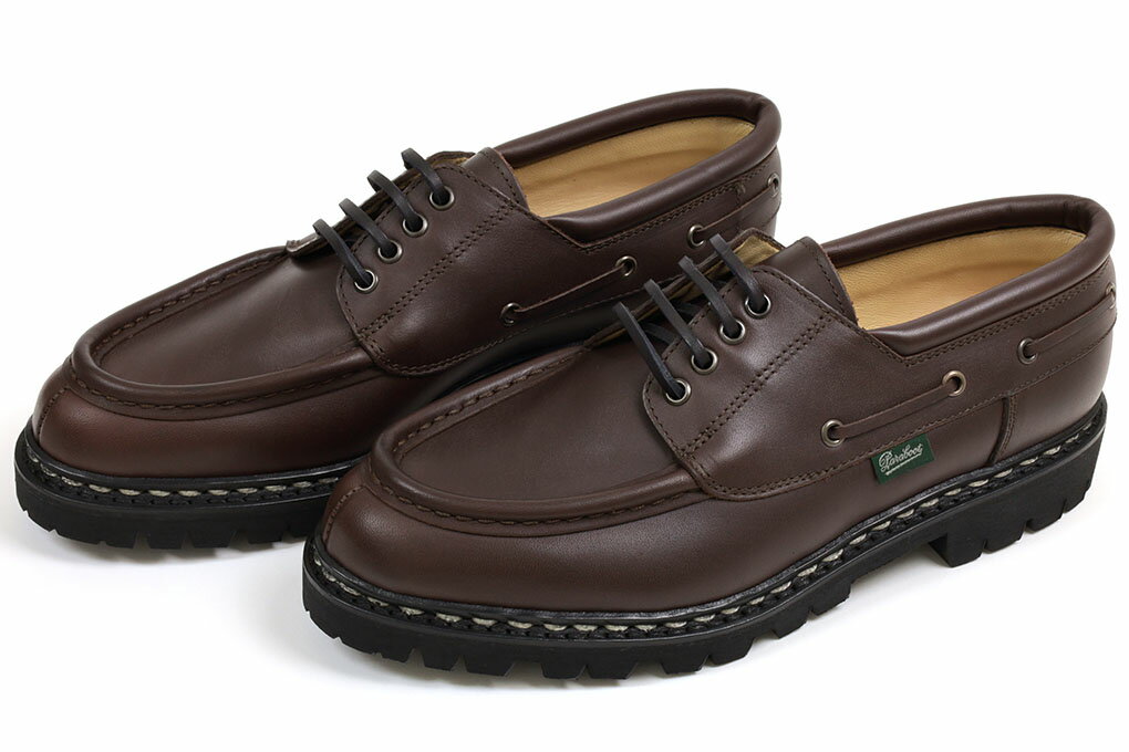 ■モデル紹介 -Paraboot CHIMEY 200816- フランスの名門ブランド、パラブーツの「CHIMEY (シメイ)」 です。 定番デッキシューズをベースに、柔らかくクッション性に優れた「ジャンヌソール」を使い、堅牢なノルヴェイジャン製法を組み合わせた、ボリューム感あるシルエットが特徴となっています。 油分を含んだ肉厚な「ワクシーレザー」と「かぶせモカ」、履き口のパッドや金属製のアイレット等、全てがヘビーな作りですが、ビジネスシーンでも人気のある代表モデル「AVIGNON」と同じ194ラストを使用し、上品な顔つきに仕上がっています。 軽いイメージのデッキシューズを重厚な「革靴」として仕立てることで、季節を問わず、幅広いスタイルに合わせる事が可能になった、大人のカジュアルシューズです。 ※レザーとコットンの2種類のシューレースが付属します。 ※できるだけ忠実に再現するよう努力しておりますが、ディスプレイ画面等の環境上、ページで見た色と実際の商品の色とは多少違う場合がございます。予めご了承下さい。