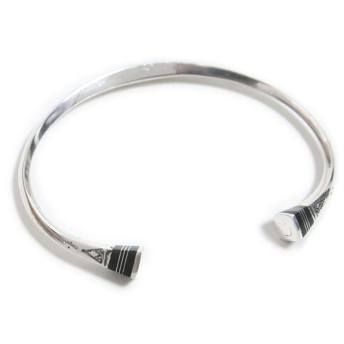 ●中央が太くなって柄がポイントになって先端に独特な飾りをあしらったトゥアレグシルバーらしいバングル ・飾り部分を見せる様に身に付けるとアクセントになります ●混じり気のない純度100%のシルバーを採用。 ・ほぼ純銀に近いシルバーは柔らかさのある素材感で、上品な存在感のある表情が特徴。 ・鏨(たがね)という特殊な道具で一点一点彫を入れて作っています ・[BANGLE02]は接着ではなく、エボニーウッド(黒檀/コクタン) をシルバーの芯を通して作成 ・男女問わずお使い頂けます ●純度100%に近いシルバーの為、通常のシルバー925よりも柔らかいので以下の点にご注意下さい。 ・バングルを装着する際は最初にご自分のサイズに調節して下さい。 ・曲げる際は一番太い個所から調節して下さい。 ・その後は曲げたりする事はお控え下さい。(毎回折り曲げたりすると金属疲労につながり折れる事がございます) ●エボニーウッドをあしらったモデルは水に付けるのはお避け下さい。 ・商品の詳しいサイズの測り方 ●若干の誤差がございますのであくまで目安としてお考え下さい クリックすると一覧ページにリンクします。 クリックすると一覧ページにリンクします。 クリックすると一覧ページにリンクします。 クリックすると一覧ページにリンクします。 TOUAREG SILVER (トゥアレグシルバー) [BANGLE02] バングル (SLIVER/EBONY WOOD) ↑クリックすると【TOUAREG SILVER】の商品一覧ページにリンクします 普遍的且つネイティブなインディアンジュエリーとは一味違う独自のデザインが特徴のアクセサリー アフリカ大陸北部に存在する世界最大の砂漠であるサハラ砂漠。 その中を遊牧しながら生活している青き民トゥアレグ族。シルバー細工は伝統工芸として代々受け継がれて来た文化。 ヨーロッパの国(特にフランス)ではネイティヴジュエリーと言えばこのトゥアレグシルバーの名が挙がるほどですし、フランスを代表するブランドであるHERMESよりコレクションが発表されているほどポピュラーな存在。 純銀(ほぼ100%に近いSilver)を使い、鏨(タガネ)を使って柄を生み出す手彫りが特徴です。 【BANGLE 02】 アフリカのトゥアレグ族が代々受け継いだ日本でいう家門の様な部族のファミリーを象徴する独特な柄をあしらったバングル。 [BANGLE 01][BANGLE 03]はシルバーのみで、[BANGLE 02]はエボニーウッド(黒檀/コクタン) とのコンビネーションです。 インディアンジュエリーと一線を画すジュエリーは相反する上品さと素朴さを独自に表現 身に付けるだけでほぼ純銀といっても良いエレガントさのある素材感とハンドメイドならではのクラフト感を漂わせます。 インディアンジュエリーのハードなイメージが苦手なお客様やシンプルなアクセサリーは好きだけどインパクトのあるデザインでなく人とは少し違ったモノを探しているというお客様には特におススメです。個人的には普段アクセサリーを付けないというお客様に是非ともチャレンジして頂きたいジュエリーです。 当然、女性が身に付けても良いのでカップルやご夫婦でもお使い頂けます。 -MATERIAL- 混じり気のない純度100%のシルバーを採用。 ・ほぼ純銀に近いシルバーは柔らかさのある素材感で、上品な存在感のある表情が特徴。 -DETAIL- ・中央が太くなって柄がポイントになって先端に独特な飾りをあしらったトゥアレグシルバーらしいバングル ・飾り部分を見せる様に身に付けるとアクセントになります ・鏨(たがね)という特殊な道具で一点一点彫を入れて作っています ・[BANGLE02]は接着ではなく、エボニーウッド(黒檀/コクタン) をシルバーの芯を通して作成 ・男女問わずお使い頂けます [ATENTION] ●純度100%に近いシルバーの為、通常のシルバー925よりも柔らかいので以下の点にご注意下さい。 ・バングルを装着する際は最初にご自分のサイズに調節して下さい。 ・曲げる際は一番太い個所から調節して下さい。 ・その後は曲げたりする事はお控え下さい。(毎回折り曲げたりすると金属疲労につながり折れる事がございます) ●エボニーウッドをあしらったモデルは水に付けるのはお避け下さい。 Size サイズの目安 13cm 手首(一周)が14〜17cmの方で SIZE 13cm(内径) 相当 15cm 手首(一周)が17〜19cmの方で SIZE 15cm(内径) 相当 Countory (生産国) Made In Africa Fabric (素材) SILVER / EBONY WOOD Style Name(スタイルネーム) BANGLE 02