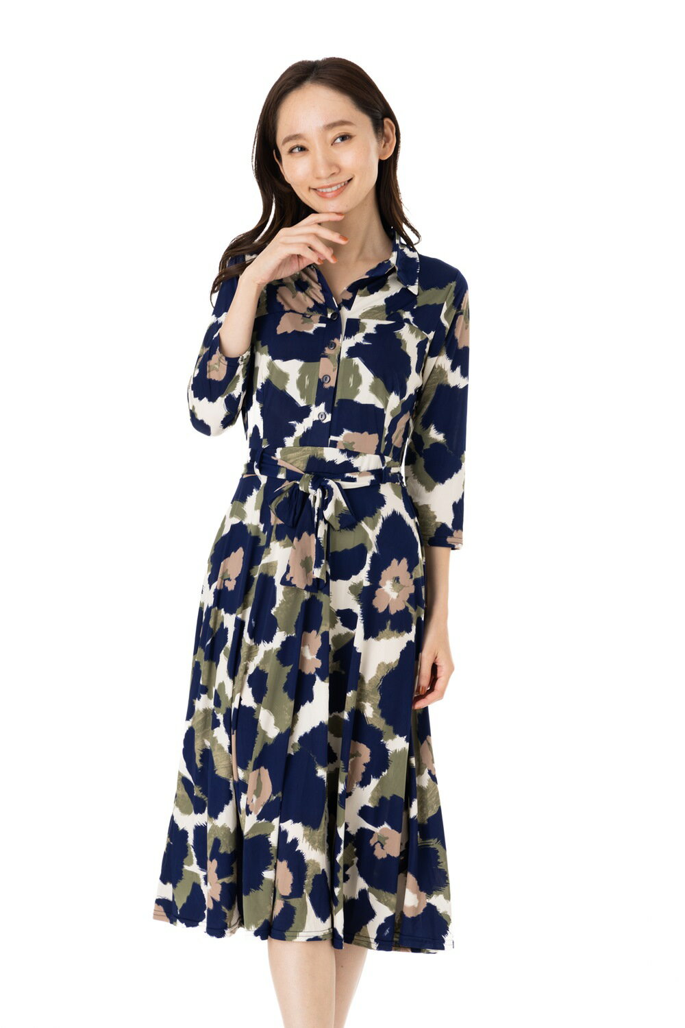 エジェリワンピース EGERIEワンピース T1 T2 T3サイズ 七分袖 ミモレ丈ワンピース 総柄 襟 ジャージー素材 インポートワンピース グリーン