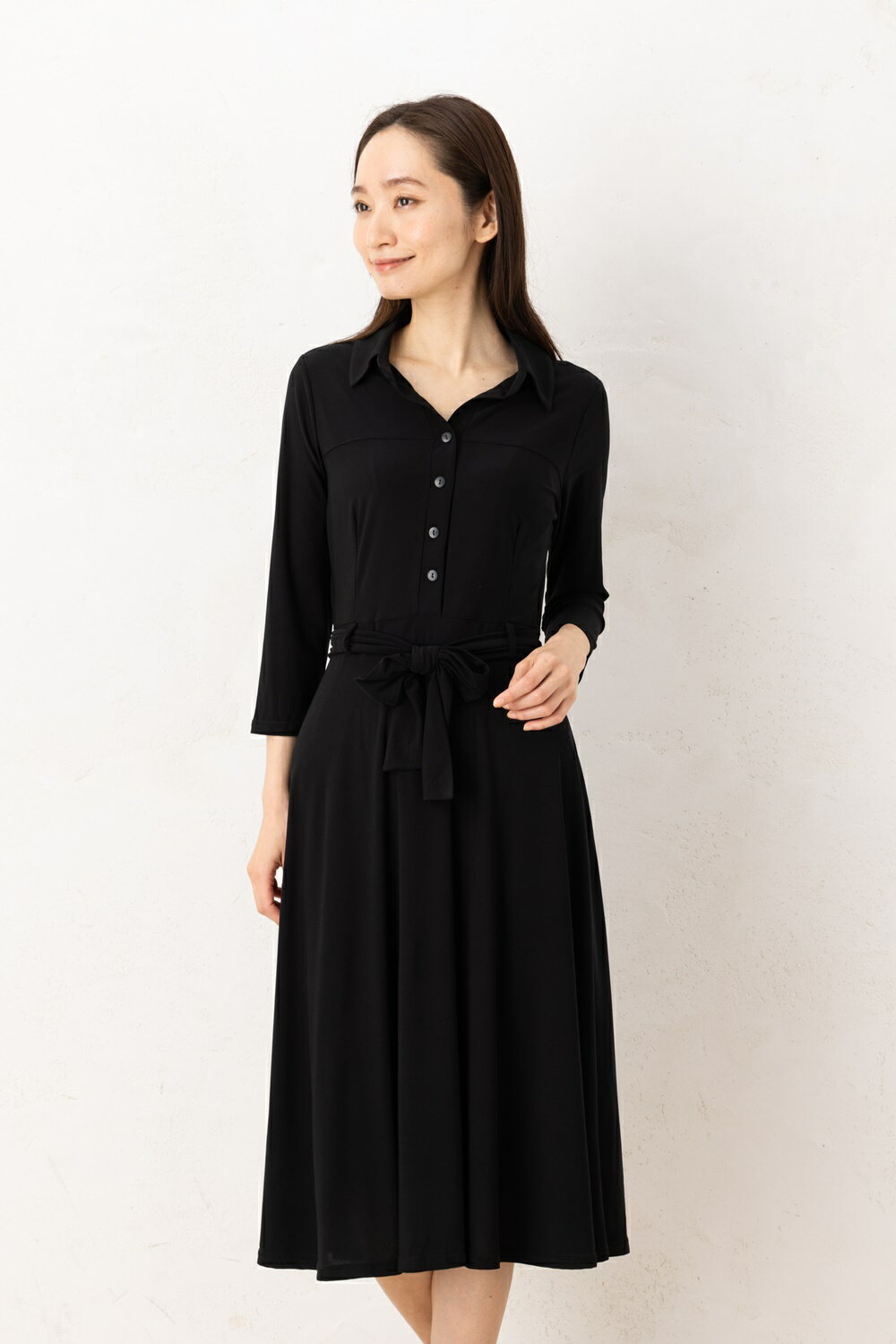 エジェリワンピース EGERIEワンピース T1 T2 T3サイズ 七分袖 ミモレ丈ワンピース 無地 襟 ジャージー素材 インポートワンピース ブラック