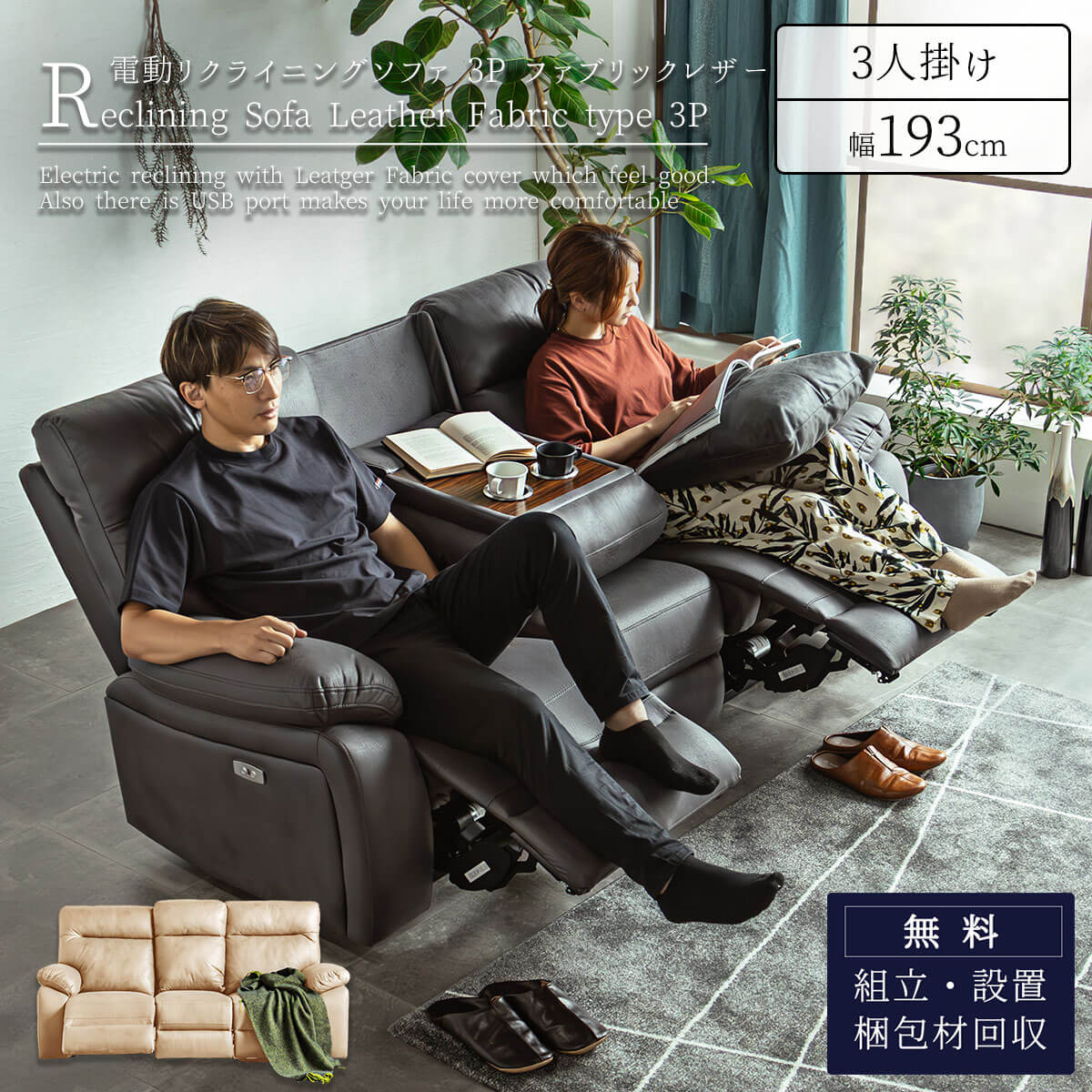 SS限定!割引商品!【開梱設置付】幅193 幅193cm モダン レトロ レザーファブリック 布 北欧 両側電動 両側リクライニング 左右電動 映画館 車 ホテル ロビー エントランス USB 充電 IV GY スマホ スマートフォン タブレット