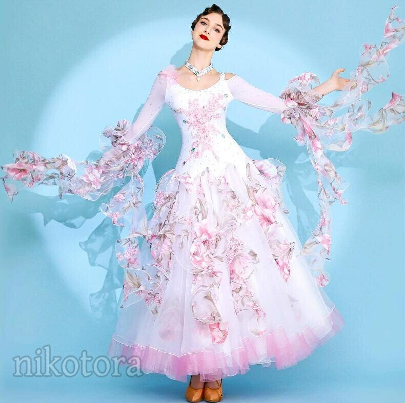 社交ダンス モダンドレス 衣装 初心者 ワンピース スタンダード 花柄 袖花飾り エレガント 人気 大人 高品質 社交ダンス衣装 タンゴ サンバ 社交ダンス ラテンダンスドレス ワルツドレス 広がる裾 社交ダンス練習着 レッスン着 競技着 演出用 ステージ衣装 ダンス発表会 白色