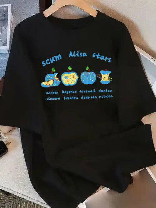 200gの4つの青いりんごの図案と「archer」「beyonce」「farewell」「danica」「sincere」「hushnow」「deep sea acacia」などの文字、スタイルの潮流、文芸、丸首の半袖スタイルに属して、日常のカジュアルな服装に適します。箇性とファッションを演出できます。