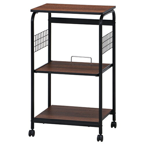 シンプルなデザインのレンジワゴンです。中棚は可動式で前に引き出すことができます。キャスター付きで移動もラクにできます。お客様組み立て商品です。 サイズ:幅515x奥行410x高さ895mm。重量:10kg。材質:合成樹脂化粧パーティクルボード、スチール。ブラックxブラウン。 必ず本来の用途だけにご使用下さい。商品に変形や大きながたつきなど異常が見受けられる際は使用しないで下さい。立ち上がる際に体重を掛ける等、商品に過度の荷重を掛けないで下さい。商品を踏み台代わりにしたり、不安定な状態でのご使用はお止め下さい。お客様都合による返品はお受けできません。