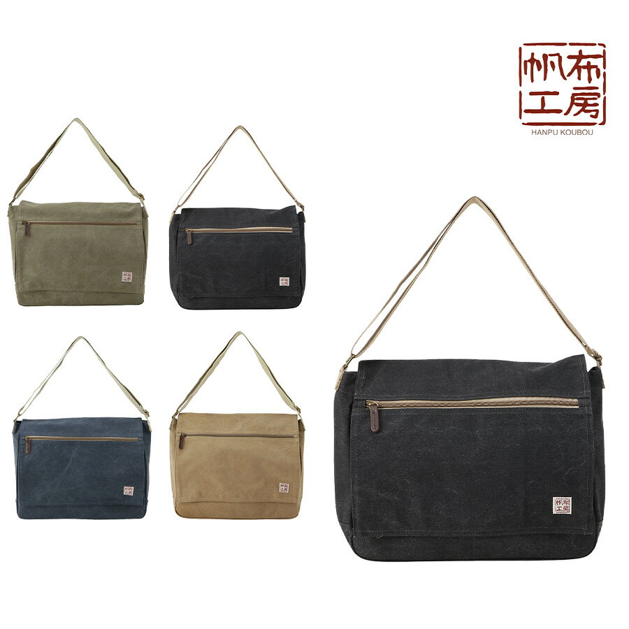 帆布工房(ハンプコウボウ) FLAP SHOULDERシリーズ ショルダーバッグ 商品番号:3X81 タウン、トラベルに最適な「帆布工房 FLAP SHOULDER(フラップショルダー)」シリーズのA4ショルダーバッグです。ムラ染め風で味のある10号帆布を使用しています。 レディースにもメンズにも合わせやすいシンプルで実用性を重視したデザインで、斜めがけしやすいキャンバスショルダーバッグです。 フラップにもファスナーポケットが付き、フラップ下はクイックな取り出しが可能な大きめのオープンポケット。メイン収納部分は取り出しやすいスナップ開閉です。 スマホ、財布、折りたたみの傘など小物はもちろん、タブレットやA4ファイル類もしっかり収納できるので、通勤・通学にもおススメです。 【商品詳細】※あくまで参考程度にご参照下さい。 素材 綿(帆布) サイズ 約26×36×11cm (タテ×ヨコ×マチ) 【ご注意】 ・モニター、画面環境、照明などの関係上 実際のお色味と多少異な場合がございます。 ・サイズ、重量などあくまで参考としてご覧いただきますようお願いいたします。 ・この商品は当店実店舗でも販売しております。在庫数の更新は随時行っておりますが、お買い上げいただいた商品が品切れになってしまうこともございます。その場合、お客様には必ずご連絡いたしますが、万が一入荷予定がない場合は、キャンセルさせていただく場合もございますことをあらかじめご了承くださいませ。