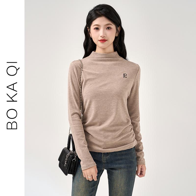 シャツ レディース ファッション 秋冬 ハーフ ハイネック 刺繍 起毛 長袖 インナー Tシャツ 女性 ガーリー スリム