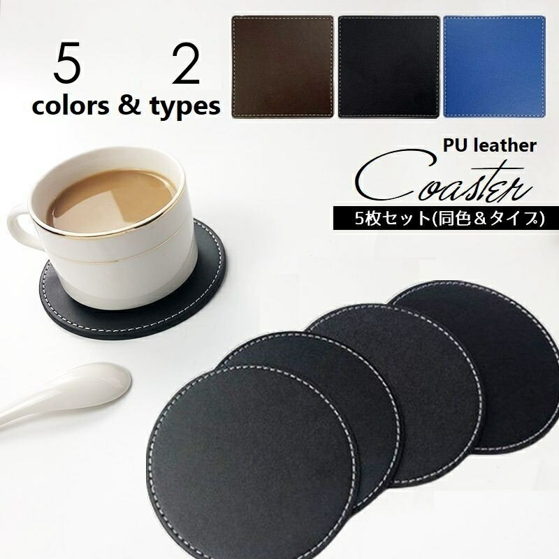 送料無料 コースター 5枚セット レザー調 グラス置き 10cm 円形 四角 ラウンド スクエア シンプル スタイリッシュ ホテルライク ステッチ 無地 キッチン雑貨 ブラック ブラウン ブルー