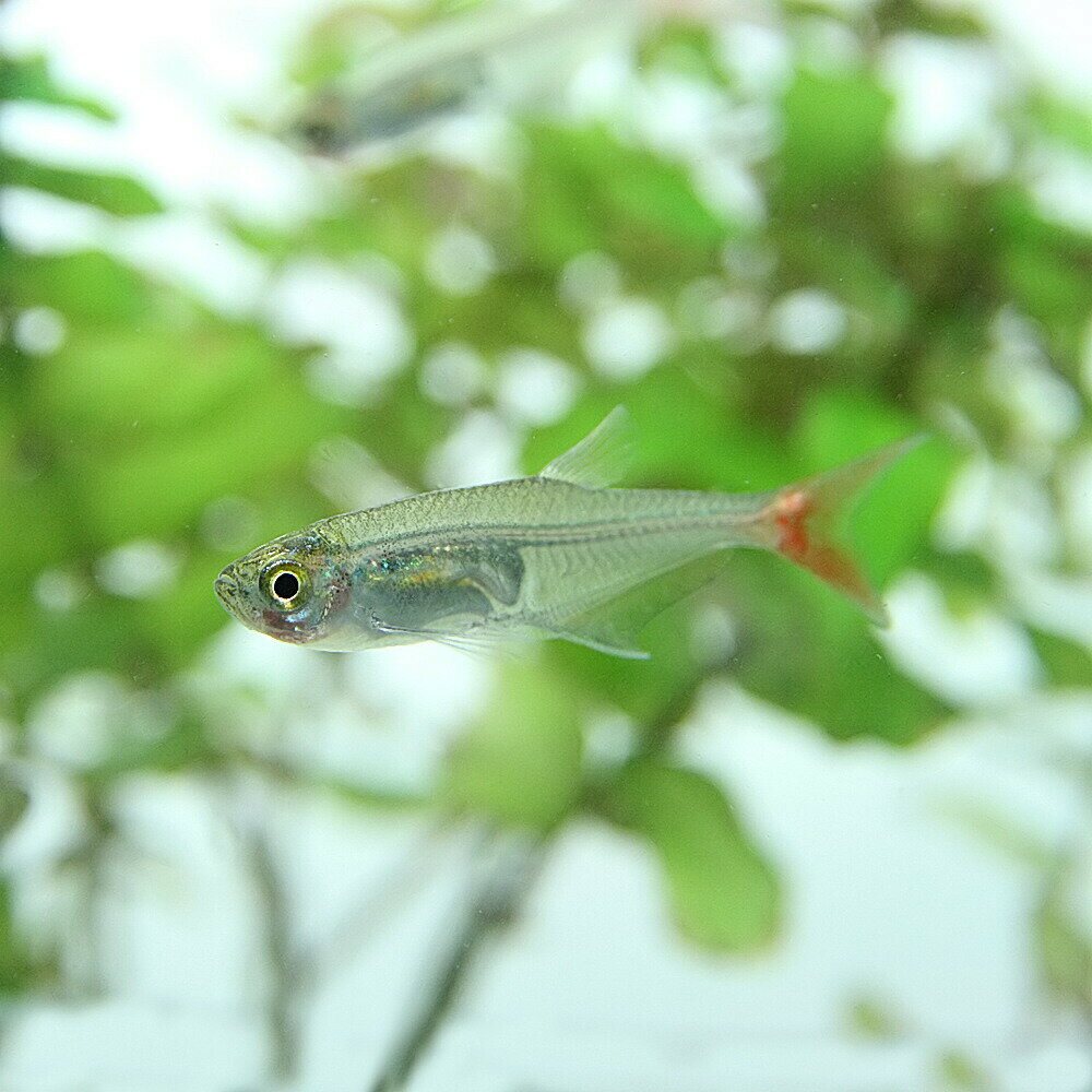 【 学名 】 Prionobrama filigera 【 最大 全長 】 約 6 cm 【 適正 水温 】 22 ~ 26 ℃ 【 水質 】 弱酸性 ~ 中性 【 分布 】 アマゾン 河 【 混 泳 】 温和 で 同 サイズ でし たら 問題 あり ませ ん 【 当店 の 与え て いる 餌 】 顆粒 状 飼料 【 その他 オススメ な 餌 】 冷凍 赤虫 、 フレーク 【 推奨 水槽 サイズ 】 30 cm ~ 【 特徴 】 透き通る よう な 透明 の 体 に 尾びれ の 赤色 、 尻 ビレ の 白色 の 縁取り が 爽やか な 印象 の ポピュラー な カラシン の 一種 です 。 東南 アジア から の ブリード 個体 が よく 出回り 、 飼育 も 容易 です が 夏場 の 高 水温 が 続く よう な 時 や 、 状態 が 悪く なっ た 時 は 透明 な 体 が 白く 濁っ て き て しまい ます 。 体 が 濁っ て しまっ た 場合 でも 、 正しく 換 水 で 対処 すれ ば 元 の 透明 な 体 に 戻り ます ので 早め の 対処 が 必要 に なり ます 。 普段 は 水面 付近 を よく 泳ぎ回り 見 て い て 飽き ない 種類 と いえる でしょ う 。 【 繁殖 難易度 】 ★★★☆☆ 【 入荷 頻度 】 毎週 定期 【 関連 キーワード▼(熱帯魚)