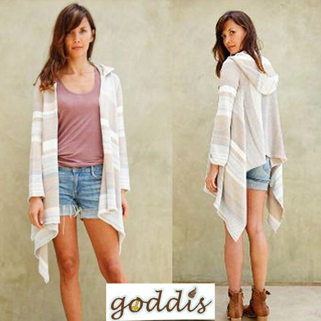 カリフォルニアのカジュアルビーチスタイルとNYのセクシーなドレスアップスタイル、その相反する2つからからインスピレーションを受けたという、ニットブランド パリス・ヒルトン、ケイト・ハドソン、ハイジ・クラム、ジェニファー・アニストンなど、LAセレブが愛用 kitsonキットソン、Planet blueプラネットブルー等の人気セレクトショップで取り扱われています。 日本ではまだ取扱いが少なく、入手困難なブランド マイリー・サイラスなどのセレブが愛用中! 前身頃の幅が長くなっていて前下がりのように見えるクールなカーディガン♪マルチカラーでもほぼグレーベージュ系で合わせやすい♪ベルスリーブがキュート♪フードがついています前身頃に続く襟がついています goddis leona bordwalk カラーブルー/ベージュ/ホワイト 素材 50% acrylic 50%cottonサイズ サイズS/M(7号から11号程度):着丈後ろ約60センチ(前は落ちると約110センチ)、身幅約44センチ、袖丈約61センチ、肩幅約45センチ 生産ブラジル納期 即納パンツ:sauce、シャツ:LNA 取り扱いブランド
