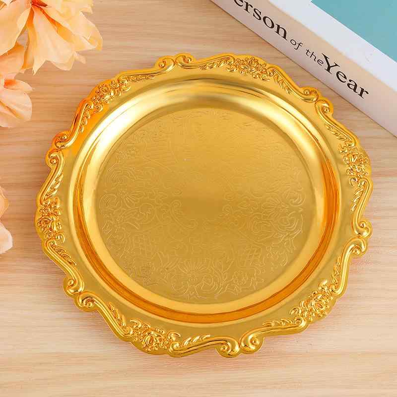 プレート ゴールド 丸型 おしゃれ 高級感 ケーキ皿 フルーツ皿 お菓子皿 コースター アクセサリー ジュエリー収納 ディスプレイトレイ 家庭用 アイアン製 蓮模様 上品 レトロ調