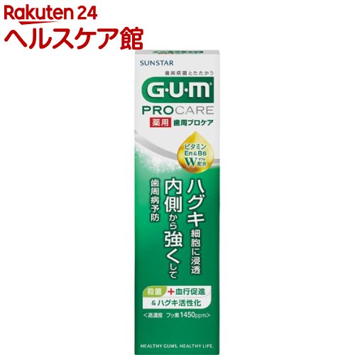 お店TOP>日用品>オーラルケア>歯磨き(ハミガキ)>歯周病歯磨き>ガム(G・U・M) 薬用 歯周プロケア ペースト (90g)商品区分:医薬部外品【ガム(G・U・M) 薬用 歯周プロケア ペーストの商品詳細】●これからの歯周病予防は殺菌だけではなく、W(ダブル)のビタミン効果でハグキを内側から強くする!【販売名】薬用GUMペーストPCF【効能 効果】効能・・・歯周病(歯肉炎・歯周炎)予防、口臭予防、口中浄化、ムシ歯の発生及び進行の予防【成分】基剤・・・ソルビット液湿潤剤・・・濃グリセリン、PG清掃剤・・・無水ケイ酸粘結剤・・・無水ケイ酸、キサンタンガム、アルギン酸Na発泡剤・・・アルキルグリコシド安定剤・・・POE硬化ヒマシ油、酸化Ti香味剤・・・香料(メディカルミントタイプ)、サッカリンNa薬用成分・・・フッ化ナトリウム(フッ素)、ニコチン酸トコフェロール(ビタミンEn)、β-グリチルレチン酸(β-GR)、塩化セチルピリジニウム(殺菌剤CPC)、塩酸ピリドキシン(ビタミンB6)可溶化剤・・・オレイン酸PEG着色剤・・・黄4、緑3【注意事項】●6歳未満への使用を控える●子供の手の届かない所に保管する●発疹、かゆみ等が現れた場合は使用を中止し、医師に相談する●目に入った時は、こすらずすぐに水で充分洗い流す●直射日光のあたらない場所に保管する【原産国】日本【ブランド】ガム(G・U・M)【発売元、製造元、輸入元又は販売元】サンスターリニューアルに伴い、パッケージ・内容等予告なく変更する場合がございます。予めご了承ください。サンスター569-1195 大阪府高槻市朝日町3-10120-008241広告文責:楽天グループ株式会社電話:050-5577-5042[歯磨き粉 ハミガキ/ブランド:ガム(G・U・M)/]