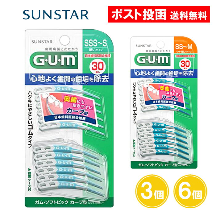 GUM ガム・ソフトピック カーブ型 30本入 3個 6個 歯間ブラシ SSS〜S SS~M ゴム SSS 極細 サンスター