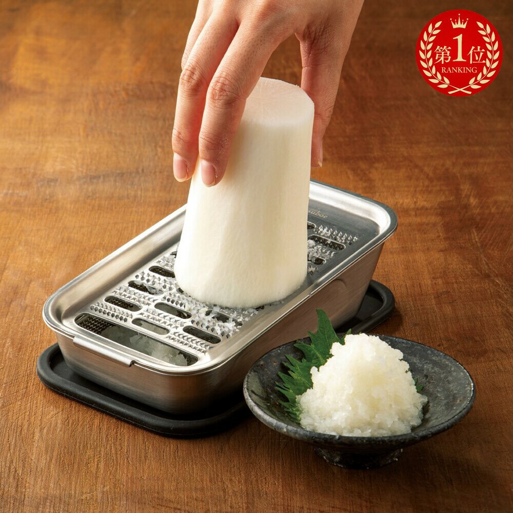 ※おひとり様1点・1回限りのご購入とさせていただきます。料理研究家の有元葉子さんもご愛用「大根おろしが好きなので、おろし金も色々試しましたが、これは本当によくできています。きめ細やかで、飛び切り美味しい大根おろしができるんです」と絶賛!口当たり滑らかなフワフワの大根おろしを実現創業110年のおろし金メーカーが”極上”と謳うこの商品は、厚い金属板を「タガネ」と呼ばれる先端が鋭利な道具を用い、一目ずつ丁寧に掘り起こす「本目立て」が施されています。切れ味と耐久性に優れているため、繊維を引きちぎることなく、切るようにおろすことができるので、フワフワとした食感のおろしが仕上がります。大根おろしを作るときの行動導線に無駄が一切ないのも高評価のポイント。大根おろしふわふわ派の方は見過ごすことができない逸品です! 軽い力で楽々おろし!誰でも使いやすいデザイン余計な力を使わずにスイスイとおろせるのがこの商品の特徴。傾斜のある容器設計により、手前から奥へスムーズにおろすことができます。刃が4方向に斜めを向いているため、大根との接点が少なく、力が一点にかかりやすいため、軽い力でしっかりとおろすことができます。優れた水切れ性能で簡単!上げ底ザルの効果ザルは上げ底になっているため水切れがよく、持ち上げるだけでしっかりと水のきれた大根おろしをいただくことができます。シリコーン蓋が活躍!滑り止めから保存までの万能アイテム付属のシリコーン蓋は1枚3役。大根をおろす時には下に敷いて滑り止めに、保管時には刃で手を傷つけないためのカバーに、大根おろしが余った時には蓋として使えてそのまま冷蔵庫に保管ができます。使い勝手抜群!すべてが一体になったおろし金セット蓋、受け皿、ザル、おろし金が一体となった使い勝手の良さも◎。すっきりと収納できて、見た目にも美しい仕上がりです。信頼の品質!燕市発のおろし金専門メーカー金物の街・新潟県燕市にある株式会社ツボエは、創業110年のおろし金専門メーカー。家庭用から業務用まで、200種類以上のおろし金を製造しています。料理研究家 有元葉子さん100冊以上の著書を持ち、雑誌やテレビなど幅広く活躍。おいしい料理はもちろん、長く使える本当にいいものを見る目や、すっきりとした快適な暮らしぶりに憧れるファンが多い。使いやすく手入れがラクでデザインが美しい、台所道具のシリーズ『ラバーゼ』のディレクター。 ページ下部に画像の説明がございます。一部別売りの商品もございますので、説明分ご確認のうえご注文ください。>画像の説明はこちら<画像の説明繊維を引きちぎることなく、切るようにおろすことができるので、フワフワとした食感のおろしが仕上がります。置いておくだけでもサマになる、美しいおろし金です。余計な力を使わずにスイスイとおろせます。ザルは上げ底になっているため水切れがよく、持ち上げるだけでしっかりと水がきれます。おろし金部分。板厚のあるステンレスを使っていることで縁を巻かずに仕上げることができており、水洗いした時に縁に水が溜まってしまうこともありません。厚い金属板を一目ずつ丁寧に掘り起こす丁寧なふわふわな作業が、口当たりの大根おろしの秘訣。左は一般的な製品、右は本製品を使用した大根おろしを水に溶かしたもの。きめ細やかさの違いは歴然!大根おろしが余った時には蓋として使えてそのまま冷蔵庫に保管ができます。滑り止めとして使える蓋つき。水切りが出来るザル付き。セット内容。一般的な大根おろしの刃の部分の拡大図。セット内容。金物の街・新潟県燕市にあるツボエは、創業110年のおろし金専門メーカー。2020年グッドデザイン賞・ベスト100受賞。料理研究家の有元葉子さんもご愛用 仕様・サイズ■サイズ(約):幅11.3×全長19.3×高さ5.9cm(シリコーン敷板含む)、おろし金…幅10.7×奥行19cm、収納時…幅11.3×全長19.3×高さ5.9cm、重量(約):554g■素材:おろし金部…18-0ステンレス、容器部・水切りザル部…18-8ステンレス、シリコーン蓋(敷板)部…シリコーンゴム(耐熱200℃、耐冷-20℃)■日本製【送料マーク:A】この商品の販売価格には配送料880円(税込)が含まれています。
