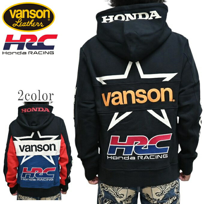 VANSON×HONDA スター×ロゴ 柄 刺繍 長袖 裏毛 F/Z パーカー ( HRV-2413 ) ばんそん ホンダ コラボ 長袖 パーカー 羽織 バイカー アメカジ ホンダロゴ HRC スター 刺繍 ブラック マルチ 2色展開 送料無料