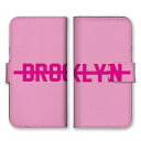 全機種対応 手帳型スマホケース iPhone14 13 Pro Max対応 BROOKLYN ブルックリン ニューヨーク ロゴ 英字 英語 シンプル ピンク ホットピンク 桃色 かっこいい カードホルダー付き カード収納 合皮 合成レザー 手帳タイプ スマートフォン ケース カバー