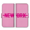 全機種対応 手帳型スマホケース iPhone14 13 Pro Max対応 NEW YORK ニューヨーク ロゴ 英字 英語 シンプル ピンク ホットピンク 桃色 かっこいい カードホルダー付き カード収納 合皮 合成レザー 手帳タイプ スマートフォン ケース カバー