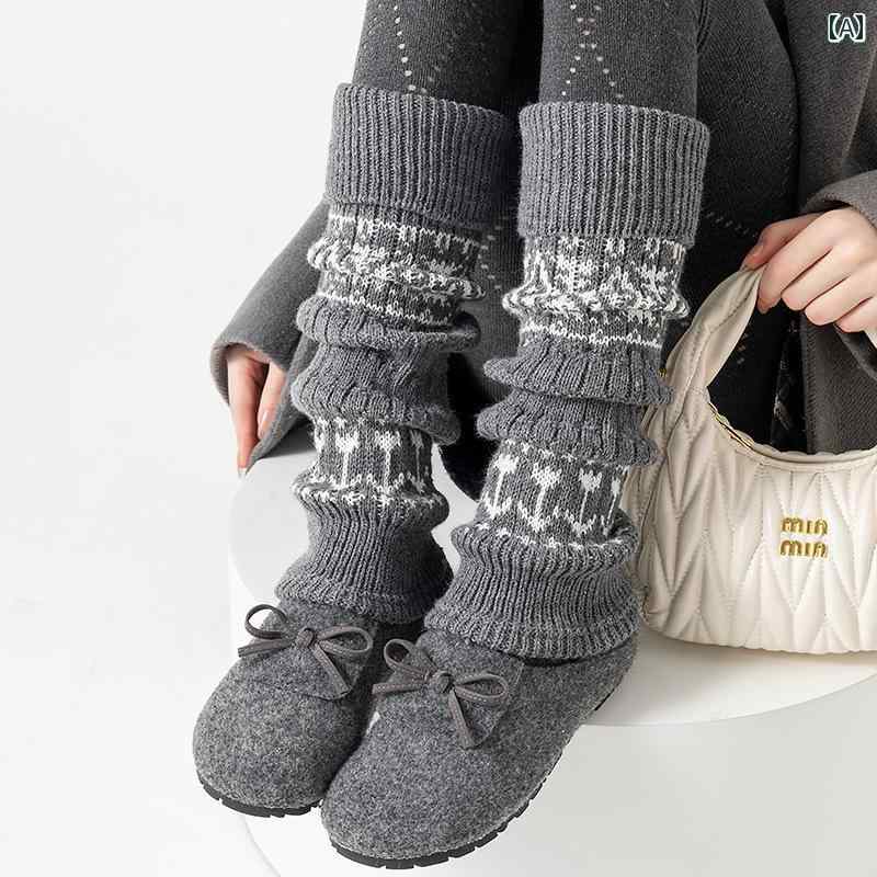 レディースソックス フェアアイル 柄の レトロ グレーの カーフ ソックスは 冬に シャーク フィン パンツや スラウチ ソックスと 重ね 着 する のに 最適です。