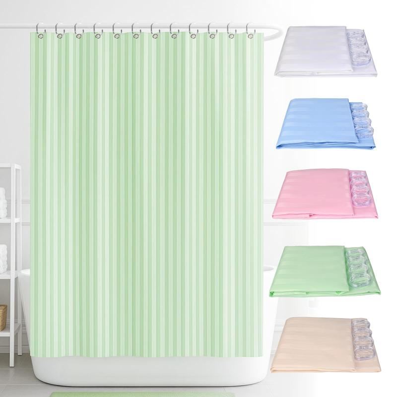 シャワーカーテン 180cm丈 シンプル ストライプ柄 防水 ユニットバス 風呂 バスカーテン【シンプルでおしゃれなデザイン】シンプルでどこにでも合わせ易い、ストライプ柄のシャワーカーテンです。鮮やかな色で、部屋がパッと明るくなります。向こう側がかすかに見えるシースルー生地を採用(遮光3級)。【撥水加工でお手入れ簡単】撥水加工を施し、防水・防カビ対策も万全。水で流して頂ければ、汚れも苦労なく落とせます。【サイズ・付属品】 幅 180 x 丈 180 cm、 取り付けリング12個付属 取り付け簡単(最初はリングが堅く感じますが、ゆっくりリングを左右に引いて開いて下さい。)【様々な用途で活躍】バスルーム、洗面スペース、キッチン等の間仕切りにご利用頂くことも可能です。【カラー】全5色 ホワイト(白色)、ブルー(青色)、ピンク(桃色)、グリーン(緑色)、ベージュ