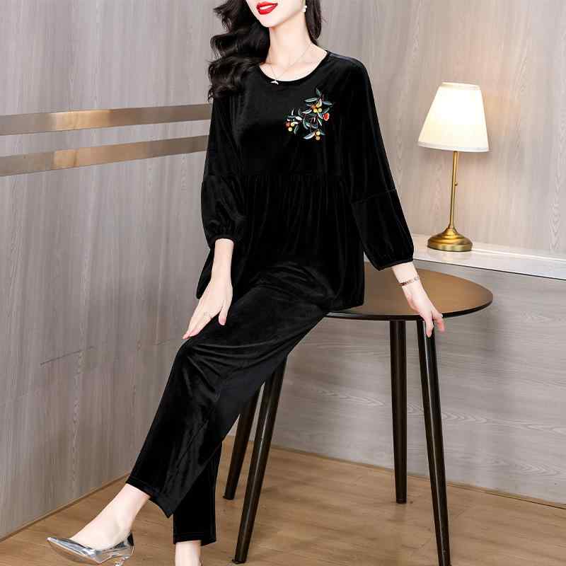 パンツセットアップ レディース ミセス 大人 ラウンドネック 刺繍 エレガント 上品 レトロ クラシック 切り替え ベロア ベルベット ブラック 黒 ポリエステル 長袖 トップス ロングパンツ 通勤 きれいめ 秋冬