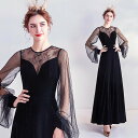カラードレス 黒ドレス【着後レビュー特典】上品で上質なブラックドレス 黒 シンプル Aライン チュール 長袖 圧倒的なボリュームのパフスリーブ ボリューム袖 ミモレ袖 チェックレース ハートカット インポート ワンピース ウェディング ドレス 披露宴 刺繍【cd-0242】