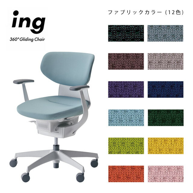 コクヨ イング CR-G3203E6 カラーコード対照表G4B6(ブラック)G4E3(ソフトグレー)G4M6(ダークグレージュ)G4MA(ミディアムグレージュ)G4Q6(ディープグリーン)G4Q4(ライトオリーブ)G4T7(ネイビー)G439(アッシュターコイズ)G47E(ディープパープル)G49G(アッシュピンク)G40T(ソフトテラコッタ)G41S(オリーブイエロー)働きやすいコンディションが生まれるオフィスチェアー「ing」 じっと動かずただ机に向かっていると、頭も体も固まってしまう。そんな状態で効率的に、クリエイティビティある仕事ができるでしょうか。デスクワークにも「動く」ことが必要ではないか、という考えからingは開発されました。動くことで座って働く人をストレスから解放。さらに、頭と体を活性化させる姿勢をつくります。人それぞれが自然体になり、心身が自由になっていく。働きやすいコンディションを生むためのオフィスチェアー、それがingです。 ポイント 体の自由な動きをさまたげない360°グライディング 2層のメカの組み合わせによって、前傾、後傾、左右のひねりまで、体のどんな動きにも追随。バネを使用しない、ブランコのようなメカは、動きはじめの負荷をなくし、体を動かしやすくしてくれます。さらに、動いた後は揺り戻しがあるため、バランスを崩すことなく、安心して体を預けることができます。 背骨を解放するランバーレスデザイン 360°グライディングが、背骨のS字カーブを自然につくるため、背もたれにランバーサポートはありません。背骨がより開放され、体が動かしやすくなります。 3Dポスチャーサポートシート ingのポスチャーサポートは、体圧分散を適正にするとともに、前傾時の体のすべり落ちも防ぎます。 グライディングストッパー ON/OFFの切り替えができるグライディングストッパーです。グライディングする時と固定して集中して作業したい時のモード切り替えが可能です。 5本脚のキャスター 移動に便利なキャスター脚です。(※クッションフロアー上ではご使用にならないでください。床を傷つける場合があります。) 安心して体をゆらせるグリップアーム 肘は完全固定タイプ。パッド前側はクッション材で覆われた構造のため、グリップしながら安心して体をゆらすことができます。 ワークシーンに健やかさを 多彩な機能を搭載したingチェアは、さまざまなワークシーンに健やかさをもたらし、動きのある空間を実現します。 グライディング感の違いを体感できるさまざまなバリエーション ゆとりをとるか、動きやすさをとるか。グライディング感の違いを体感できるさまざまなバリエーションをご用意。背もたれデザインとマテリアルの違いで、自分に合った好みの座り心地が選べます。 タイプ別グライディング感の違い 「動きの軽さ」とは姿勢変化に必要な作動力を、「体の可動域」は体の動く範囲を示します。用途や好みの座り心地に合わせてお選びください。 使用イメージ カラーバリエーション 商品サイズ 商品について サイズ(本体)幅710×奥行590〜670×高さ960〜1050mm サイズ(その他)座面 / 幅525×奥行450mm肘高さ / 615〜705mm座面高さ / 425〜515mm 重量18.3kg 材質背板・座板 / ポリプロピレン張り地 / ポリエステル背クッション / スラブウレタン座クッション / モールドウレタン肘 / 強化ナイロン、ポリウレタンスキンモールド脚羽根 / 強化ナイロン フレームカラーブラック 背バーチカル張り地タイプ / クッション 座クッション 肘固定肘 脚キャスター脚 キャスター直径60mmポリウレタン巻きキャスター 機能・特徴・ガス圧昇降式・グライディング・メカ 2層のメカの組み合わせにより体のどんな動きにも追随。 ブランコのようにゆらゆらと揺れては戻る動きで、 バランスを崩すことなく体を預けることができます。・3Dポスチャーサポートシート 体圧分散を適正にするとともに、前傾時の体の滑り落ちも防ぎます。・フロントフリーチルト 体格や姿勢に応じて座面前部が折れ曲がります。 太腿の裏側の圧迫が少なく座面奥行きの調整が必要ありません。・グライディングストッパー 座面の動きON、OFFのモード切替えができます。・グリップアーム 肘と背座は連動して動かない構造なので肘パッドをグリップしながら 体を揺らすことができます。・チルト機構 背に体を預けることで背もたれが少し傾きます。・ランバーレスデザイン 背骨のS字カーブが自然につくられるため背もたれにランバーサポートはありません。 背骨がより解放され体が動かしやすくなります。 生産国日本 梱包数4箱 保証について1〜10年保証(部位により保証期間が変わります)※社団法人日本オフィス家具協会(JOIFA)規定に基づく※詳しくはこちらの保証ページをご確認ください。※沖縄・離島などの一部地域では発送後に発生した不良・傷などによる返品・交換は承れない場合がございます 組み立てこちらの商品は現地組立品です。(開梱・組立設置・梱包材回収まで無料で行います)※組立不要の場合は事前にご連絡をお願い致します。(納品日以