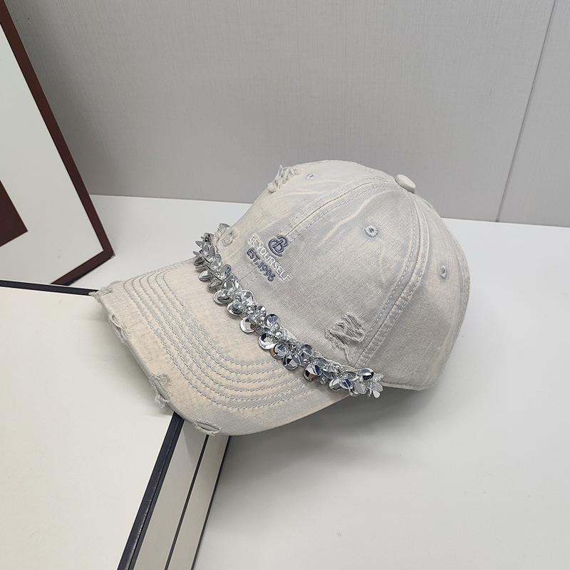 キャップ レディース 小顔効果 UV対策 防風 グレーベージュ 韓国風 スパンコール ダメージ加工 起毛 綿ポリエステル お出かけ 春夏 野球帽(x2)